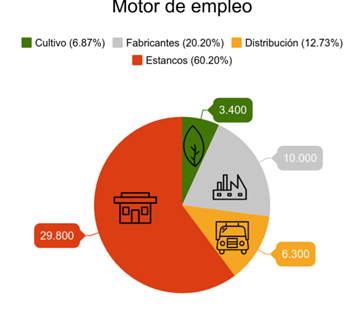 El sector del tabaco emplea en su conjunto a cerca de 50.000 personas en España de manera directa, indirecta e inducida[2], de las que un 60% están relacionadas con la venta minorista de tabaco en los estancos. En concreto, los 13.286 estancos existentes en España, que ejercen una importante función en el control de la venta del producto exclusivamente a mayores de 18 años, aportan un total de 29.800 empleos dentro del sector del tabaco.